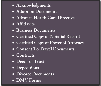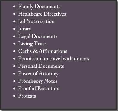 Provide Mobile Notary services for your Power of Attorney, Wills/Testament, Real Estate loan documents, and Medical facilities. Call us for free quote!